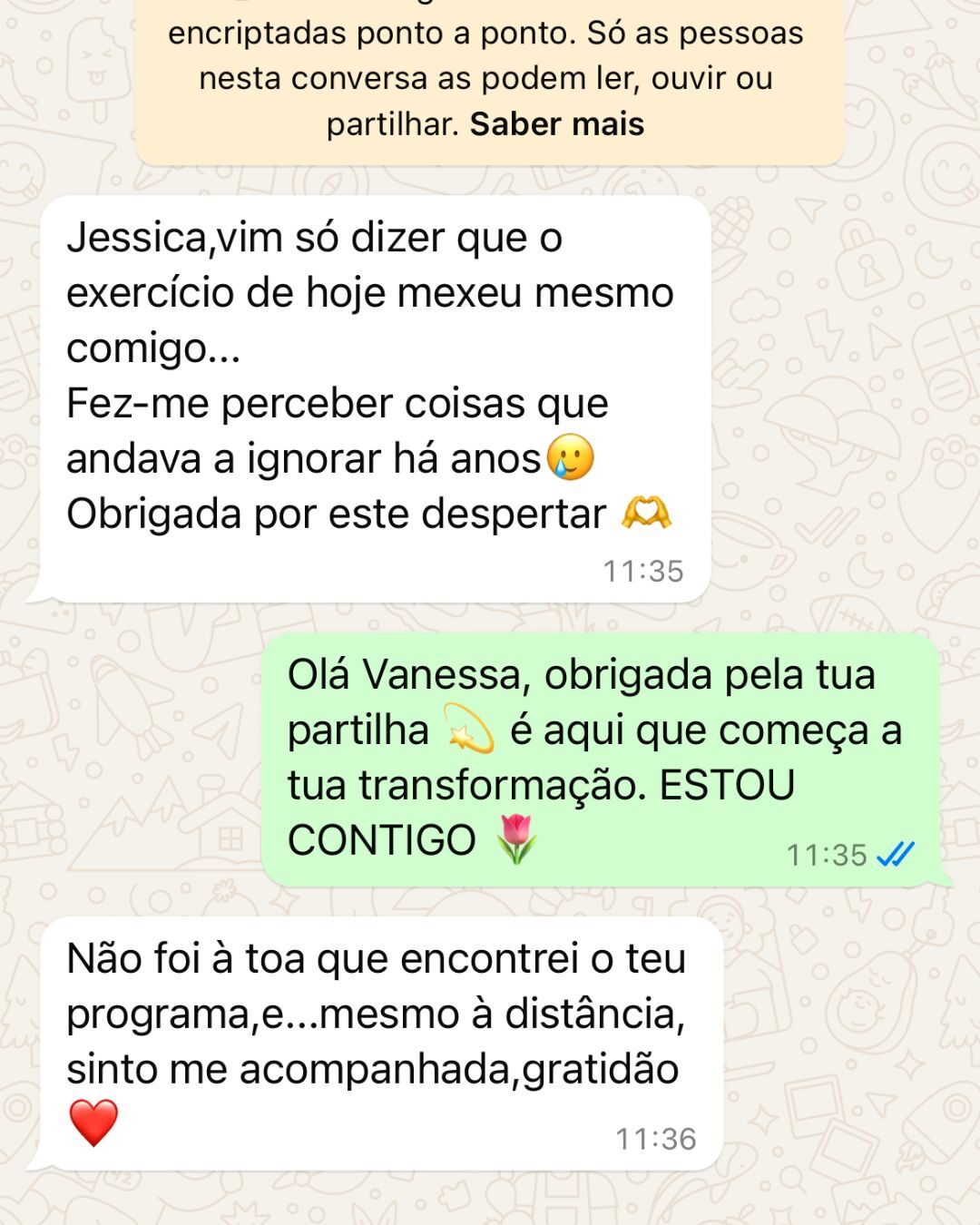 Não sou de comprar programas online, mas algo me chamou neste. E ainda bem que segui a intuição. A vida é tão mais simples do que imaginamos. Senti que fui guiada com amor e verdade em cada dia. Sinto-me mais leve e com coragem para fazer escolhas por mim. OBRIGADA